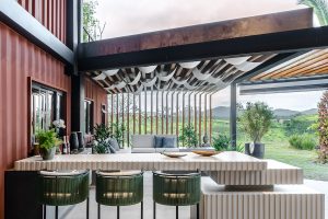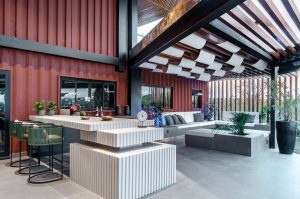 O escritório de arquitetura BAP, dos arquitetos Flávia Amado, Henrique Barsa e Romina Passos, projetou para uma casa conteiner, em Jacareí (SP), a área gourmet externa e o salão de jogos de forma conjugada, a convite do Grupo Nexus, transformando os dois espaços em um único, luxuoso e confortável ambiente.