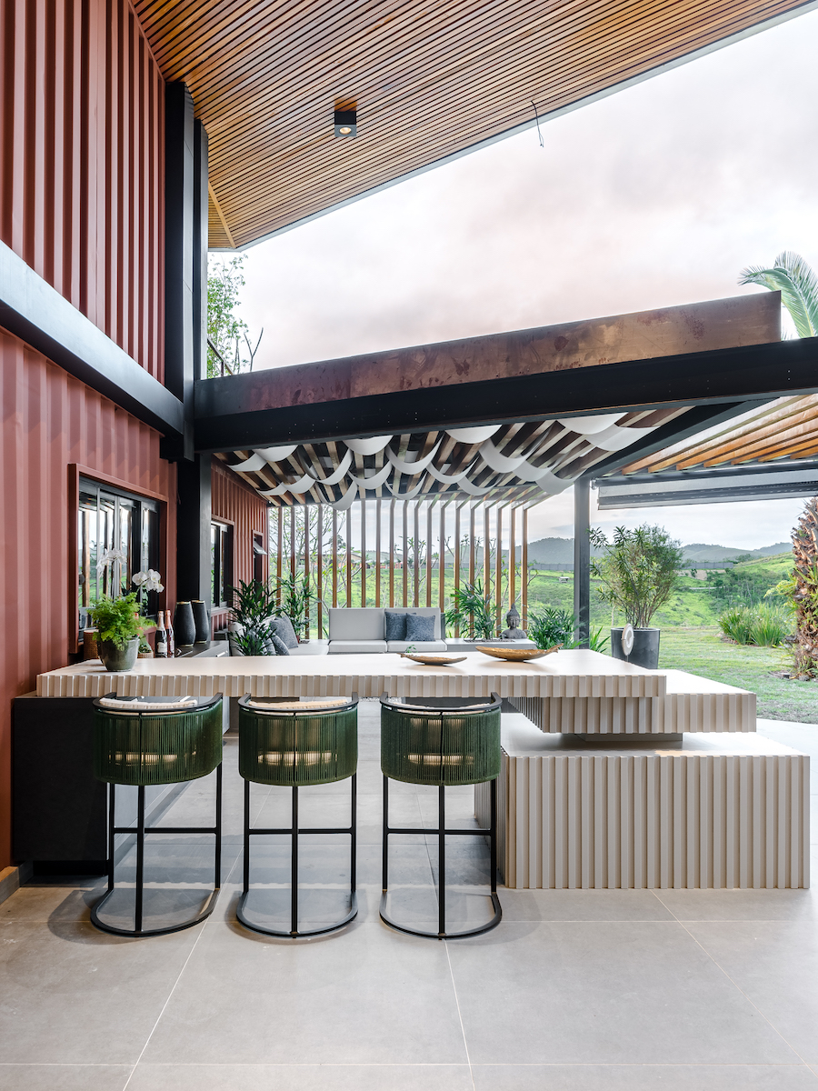 O escritório de arquitetura BAP, dos arquitetos Flávia Amado, Henrique Barsa e Romina Passos, projetou para uma casa conteiner, em Jacareí (SP), a área gourmet externa e o salão de jogos de forma conjugada, a convite do Grupo Nexus, transformando os dois espaços em um único, luxuoso e confortável ambiente.