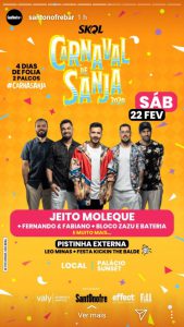 O Carnaval de Sanja 2020 terá, no primeiro dia, sábado, (22), o grupo Jeito Moleque como atração no palco principal. A dupla Fernando & Fabiano e a Banda Zazu, com a Bateira de Carnaval, também se apresentam. Na pistinha externa, rola o som de Léo Minas e a festa Kickin The Balde.