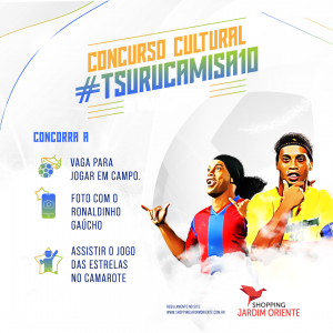 O Shopping Jardim Oriente de São José dos Campos é um dos apoiadores do jogo amistoso beneficente “Amigos do Ronaldinho X Estrelas” que será realizado no dia 22 de outubro, às 14h, no estádio Martins Pereira. E o cliente poderá ser um participante desta ação por meio do concurso cultural “Tsuru Camisa 10”.