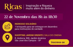 Evento para empresárias no Shopping Jardim Oriente em São José dos Campos promoverá palestras e troca de experiências sobre negócios e networking com criativos do Vale do Paraíba. É o evento ” Ricas – Inspiração e Riqueza Muito Além do Dinheiro”, que será realizado no dia 22 de novembro (quarta-feira), das 8h às 11h30, dentro do Cinépolis. As inscrições estão abertas e o ingresso é solidário, basta fazer a doação de um brinquedo novo. Inscrições: http://bit.ly/ricasinspirando