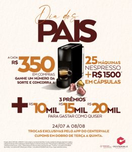 O CenterVale Shopping preparou uma promoção especial para o Dia dos Pais. Até o dia 8 de agosto, os clientes que fizerem compras a partir de R$ 350 concorrerão a prêmios de 10, 15 e 20 mil para gastar como e onde quiserem. Além disso, também serão sorteadas 25 máquinas Nespresso Mini Essenza com R$ 1.500 em cápsulas Nespresso.