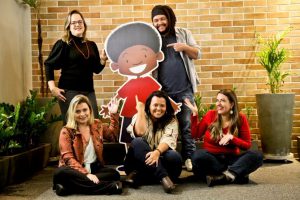 Legenda: Equipe do Projeto Contaí: Sandra Castello (em pé), Bruno Pimenta, Ana Baccaro, Paula Prado e Stefânia Andrade