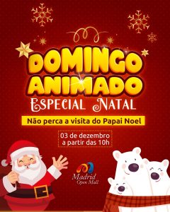 Pedro Bacha, superintendente do Madrid Open Mall, expressou sua expectativa para o evento especial de Natal: “Vamos encerrar o Domingo Animado desse ano com chave de ouro em nosso especial de Natal. Essa será a sexta edição do evento, e queremos proporcionar um momento memorável para as famílias, fortalecendo laços afetivos e promovendo interações em um ambiente seguro e acolhedor para toda a comunidade.”