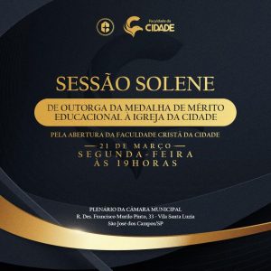 No dia 21 de março, escreveremos mais um capítulo dessa história. A Igreja da Cidade será homenageada pela Câmara Municipal de Vereadores, onde receberá a Medalha Mérito Educacional por sonhar, realizar e manter um projeto tão relevante para o nosso tempo, e você é o nosso convidado.