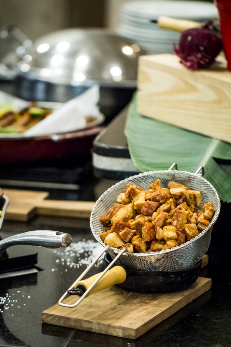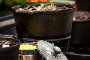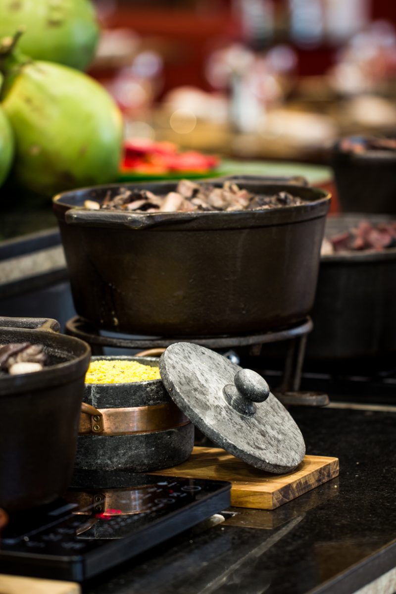 No buffet é possível se servir com 11 tipos de pertences da feijoada, além do feijão preto. Tudo separado em panelas de ferro, como paio, carne seca, pé, rabo e orelha de porco, entre outros ingredientes.