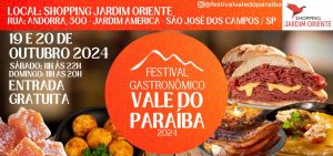 O Shopping Jardim Oriente, em São José dos Campos, receberá a segunda edição do “Festival Gastronômico – Vale do Paraíba”, com atrações de culinária regional e suas influências nacionais. O evento será no fim de semana: 19/10 (sábado), das 11h às 22h e 20/10 (domingo), das 11h às 20h. Estacionamento e Entrada Gratuitos.