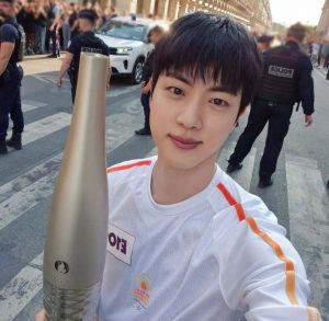 Jin, um dos integrantes do BTS, representou a Correia do Sul no revezamento da tocha olímpica, que aconteceu neste domingo (14), em Paris.