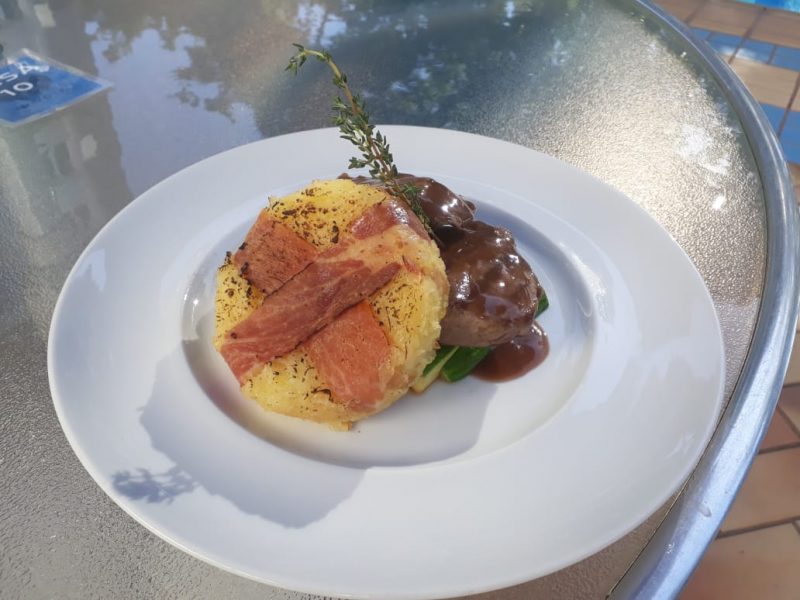 • File au poivre com saute de aspargos frescos e batata poste com Parma