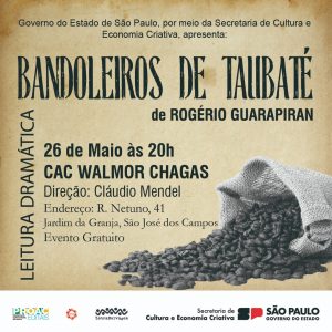 O livro de dramaturgia “Bandoleiros de Taubaté”, projeto do autor Rogério Guarapiran premiado pelo Programa de Ação Cultural (ProAC) da Secretaria de Cultura e Economia Criativa do Estado de São Paulo, poderá ser conferido pela primeira vez nesta sexta-feira (26/5), às 20h, na leitura dramática que será conduzida pela Cia Teatro da Cidade, no Centro de Artes Cênicas Walmor Chagas, em São José dos Campos.