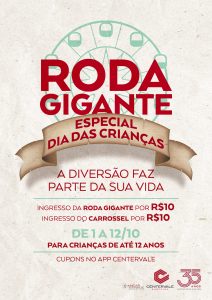 Em comemoração ao mês dedicado às crianças, de 1º a 12 de outubro, a roda gigante e o carrossel terão valores promocionais. Cada criança com até 12 anos de idade pagará R$ 10 por atração. Para adquirir o desconto, basta acessar o app do shopping e resgatar o cupom.