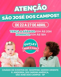 O Shopping Jardim Oriente em São José dos Campos receberá uma das feiras mais conceituadas quando o assunto é confecção para bebês e crianças, é o “Outlet Premium do Bebê e Kids”, pela primeira vez na cidade. Com peças a partir de R$6,90. O evento será de 22 a 27 de abril, no Ginásio de Eventos, ao lado do estacionamento. Entrada e estacionamento gratuitos.