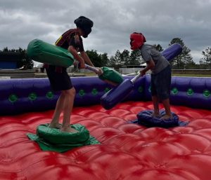 Brincadeiras com futebol de sabão, canhão de espuma, tobogãs infláveis, splash (jatos d’água).
