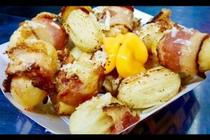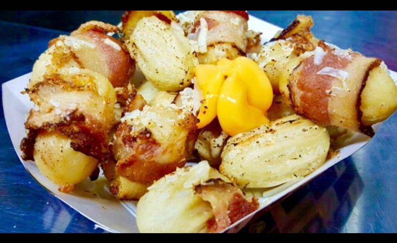 O salgado é recheado com cheddar crean cheese coberto de parmesão e bacon por cima…ele ainda é massaricado para derreter o queijo.
